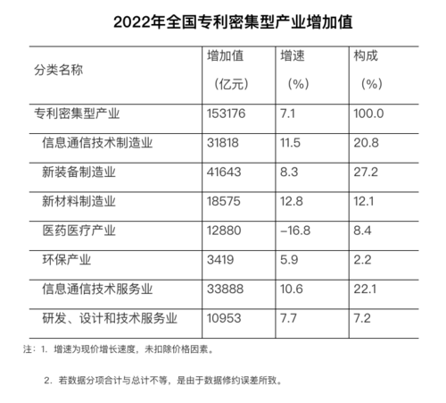 經(jīng)核算,2022年全國(guó)專利密集型產(chǎn)業(yè)增加值為153176億元,比上年增長(zhǎng)7.1%(未扣除價(jià)格因素,下同);占GDP的比重為12.71%,比上年提高0.27個(gè)百分點(diǎn)。