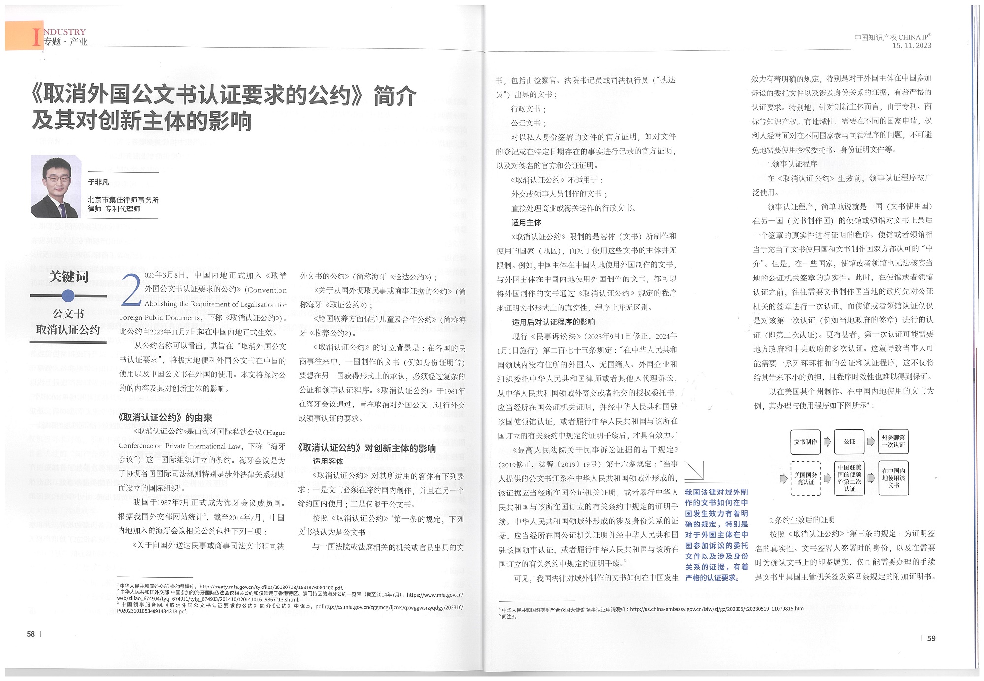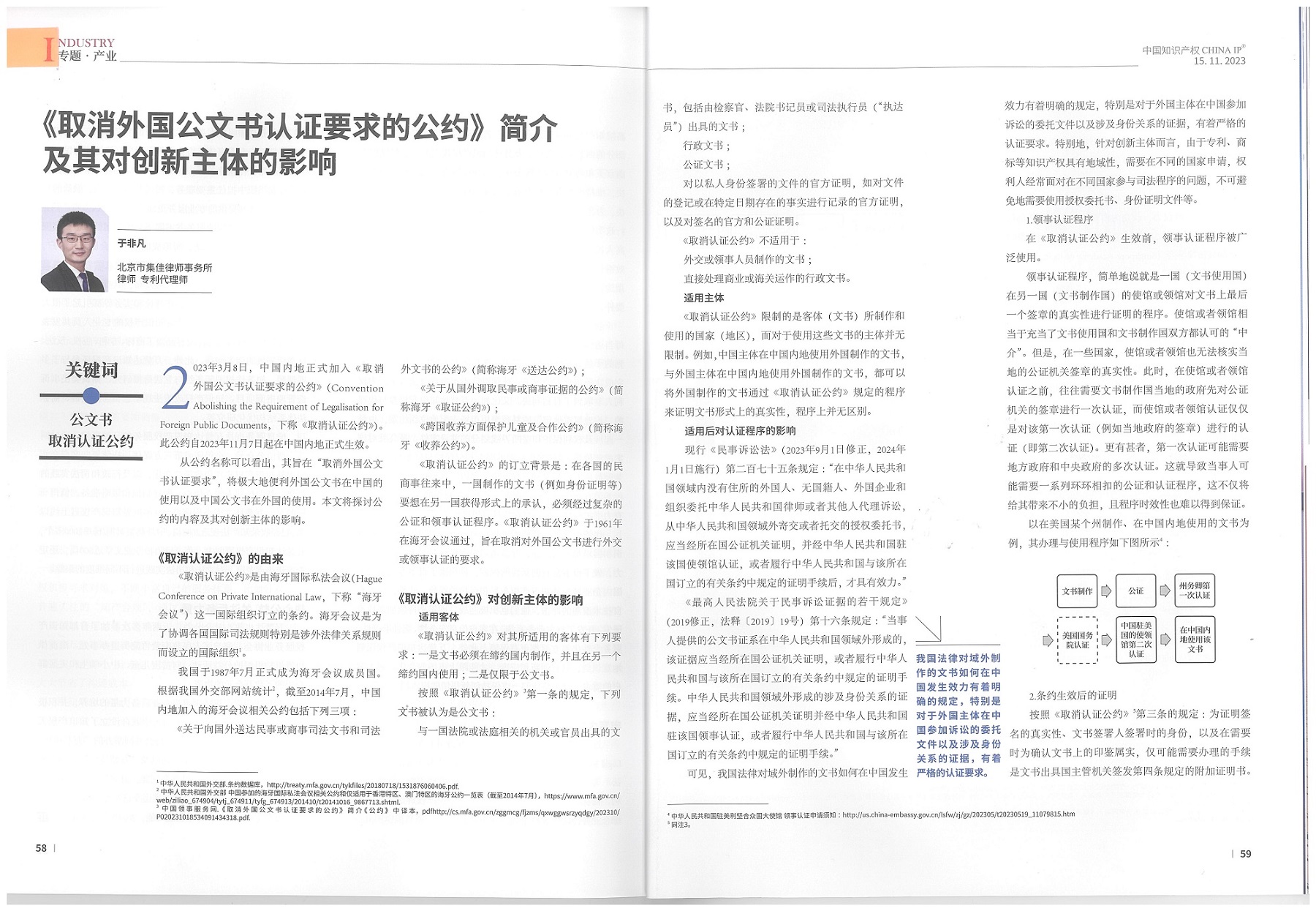 集佳文章《<取消外國(guó)公文書(shū)認(rèn)證要求的公約>簡(jiǎn)介及其對(duì)創(chuàng)新主體的影響》在《中國(guó)知識(shí)產(chǎn)權(quán)》發(fā)表