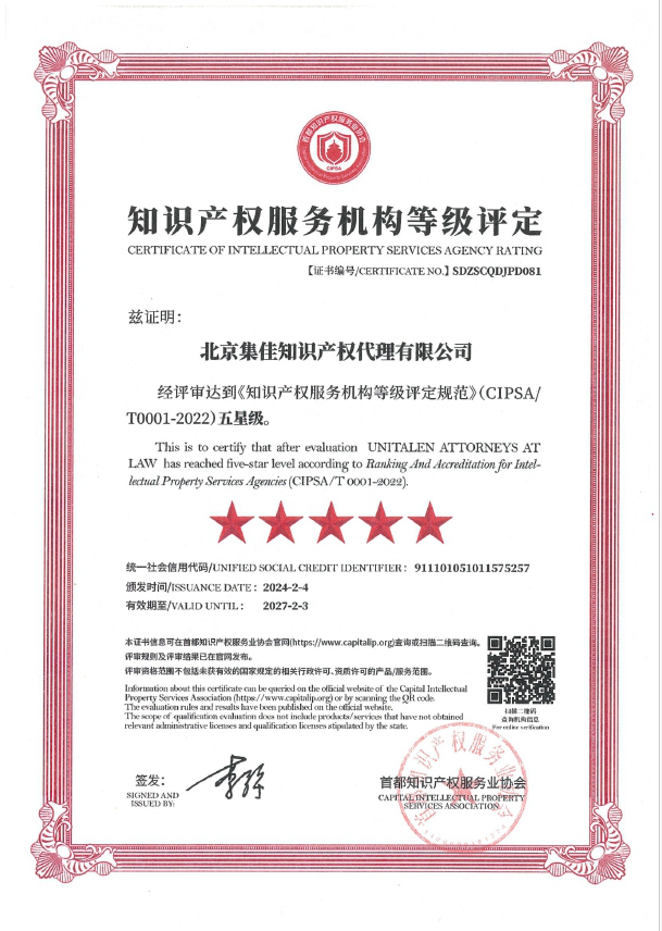 2024年2月4日,首都知識(shí)產(chǎn)權(quán)服務(wù)業(yè)協(xié)會(huì)公布2023年度知識(shí)產(chǎn)權(quán)服務(wù)機(jī)構(gòu)等級(jí)評(píng)定結(jié)果,北京集佳知識(shí)產(chǎn)權(quán)代理有限公司憑借穩(wěn)健的綜合實(shí)力獲得各界肯定,獲評(píng)首批最高等級(jí)——AAAAA級(jí)知識(shí)產(chǎn)權(quán)服務(wù)機(jī)構(gòu)。