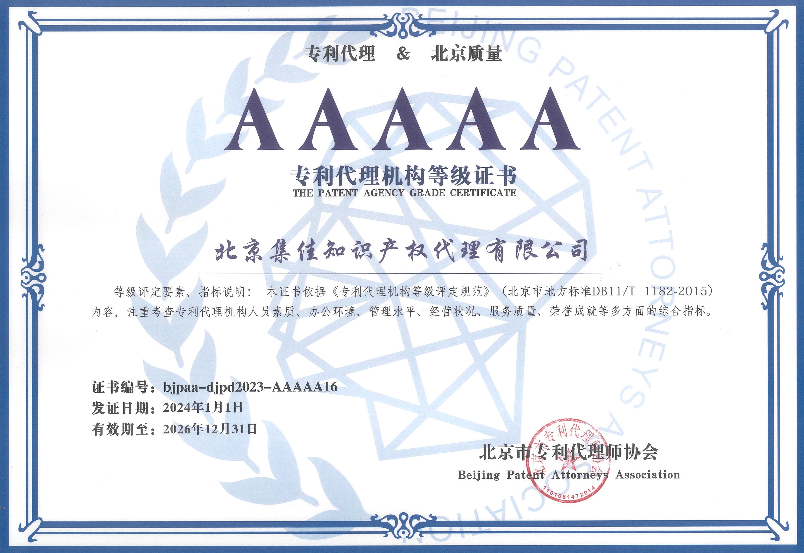 近日,北京市專利代理師協(xié)會發(fā)布2023年專利代理機構(gòu)等級評定結(jié)果,北京集佳知識產(chǎn)權(quán)代理有限公司憑借穩(wěn)健的綜合實力獲得各界肯定,再次獲評最高等級——AAAAA級專利代理機構(gòu)。