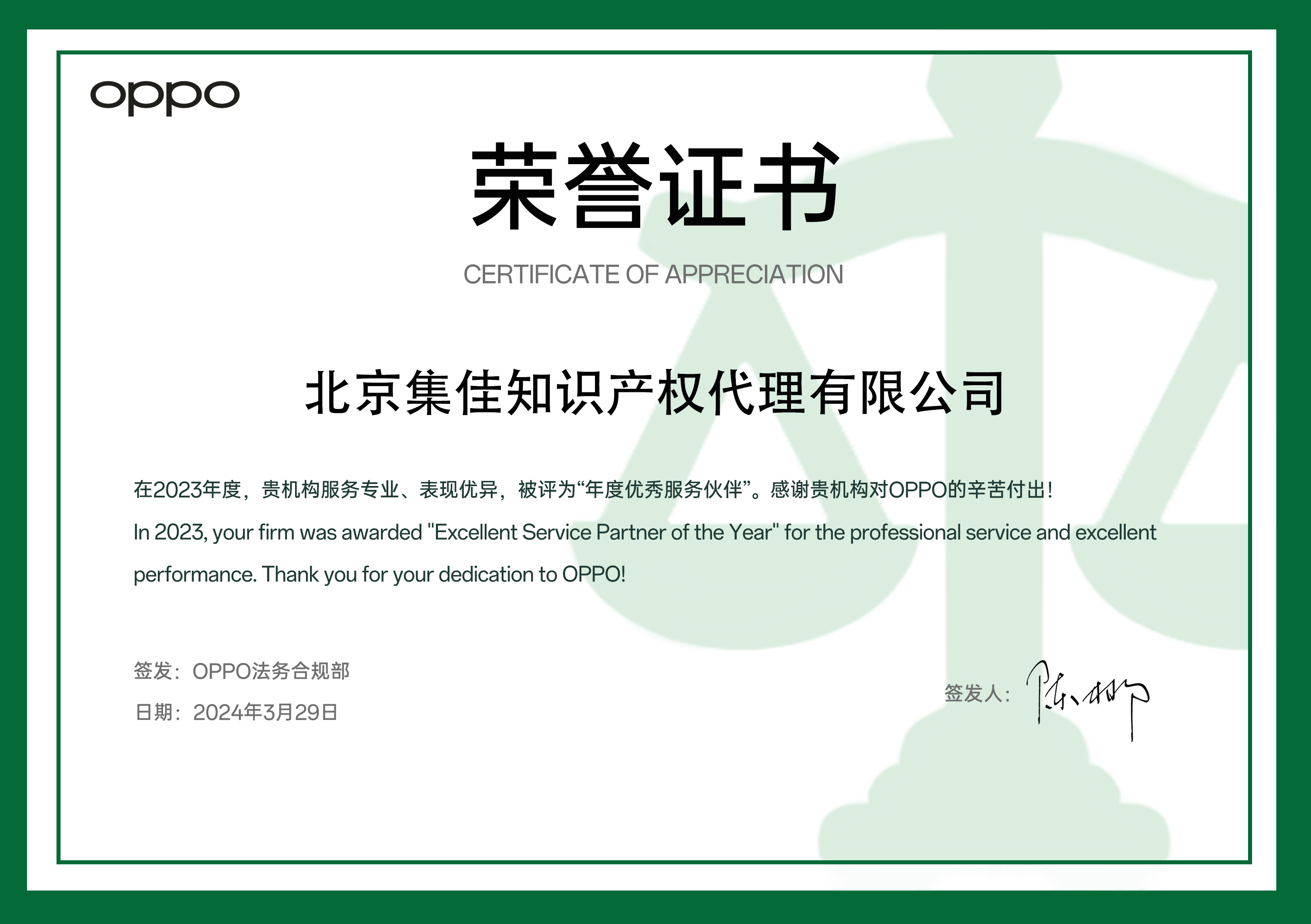 近日,集佳喜獲客戶OPPO授予“年度優(yōu)秀服務伙伴”榮譽證書,這是集佳與OPPO多年來精誠合作的證明,更是對集佳專業(yè)水平的肯定與認可。