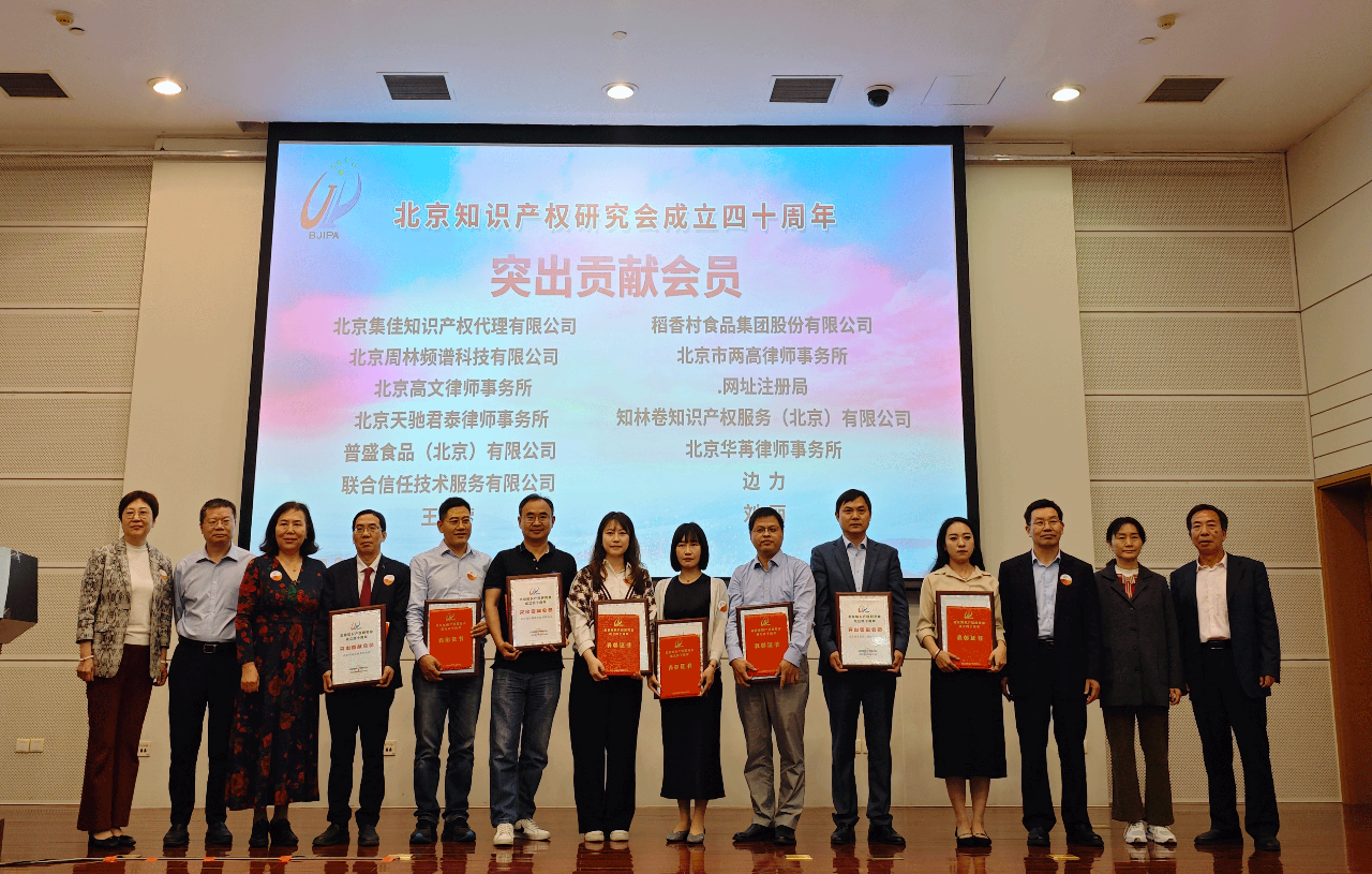 2024年4月27日,北京知識產(chǎn)權(quán)研究會成立四十周年慶典暨數(shù)字經(jīng)濟(jì)與知識產(chǎn)權(quán)論壇隆重召開。在慶典儀式上,北京知識產(chǎn)權(quán)研究會會長、北京航空航天大學(xué)教授孫國瑞向在研究會工作中做出突出貢獻(xiàn)的個人和機(jī)構(gòu)頒發(fā)了榮譽(yù)牌匾,北京集佳知識產(chǎn)權(quán)代理有限公司獲評“突出貢獻(xiàn)會員”榮譽(yù)稱號。