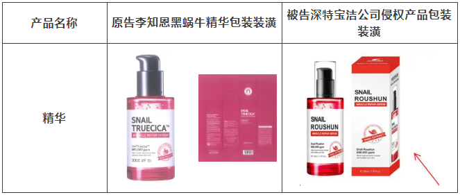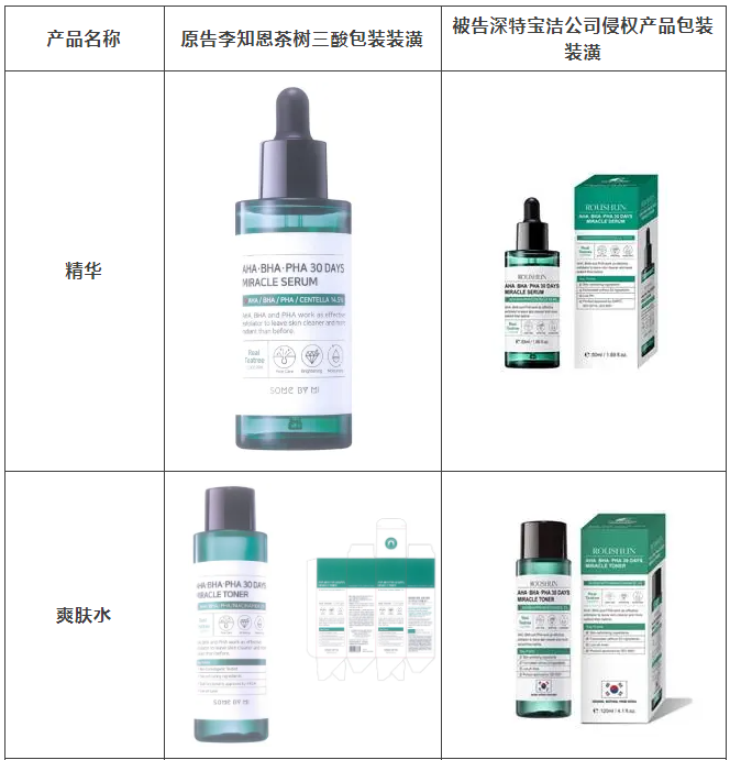 2021年原告委托北京市集佳律師事務(wù)所調(diào)查發(fā)現(xiàn),被告汕頭市深特寶潔實(shí)業(yè)有限公司生產(chǎn)、銷售和推廣的“茶樹祛痘美白補(bǔ)水液”“茶樹香皂”等護(hù)膚品,其產(chǎn)品包裝裝潢直接抄襲、摹仿原告前述已經(jīng)具有較高知名度和影響力的“SOME BY MI/莎柏蜜”茶樹三酸系列化妝品和黑蝸牛精華液的包裝、裝潢設(shè)計(jì),使用與之近似的標(biāo)識,造成消費(fèi)者混淆誤認(rèn)。故原告作為茶樹三酸、黑蝸牛精華包裝裝潢權(quán)益獲益人,訴至廣東省汕頭市中級人民法院。汕頭中院認(rèn)定:李知恩主張的茶樹三酸、黑蝸牛精華包裝裝潢構(gòu)成具有一定影響的包裝裝潢,深特寶潔公司生產(chǎn)、銷售茶樹三酸、黑蝸牛精華液的行為構(gòu)成不正當(dāng)競爭。因判賠額不符合原告預(yù)期,原告后上訴至廣東省高級人民法院,廣東省高級人民法院最終維持一審判決。