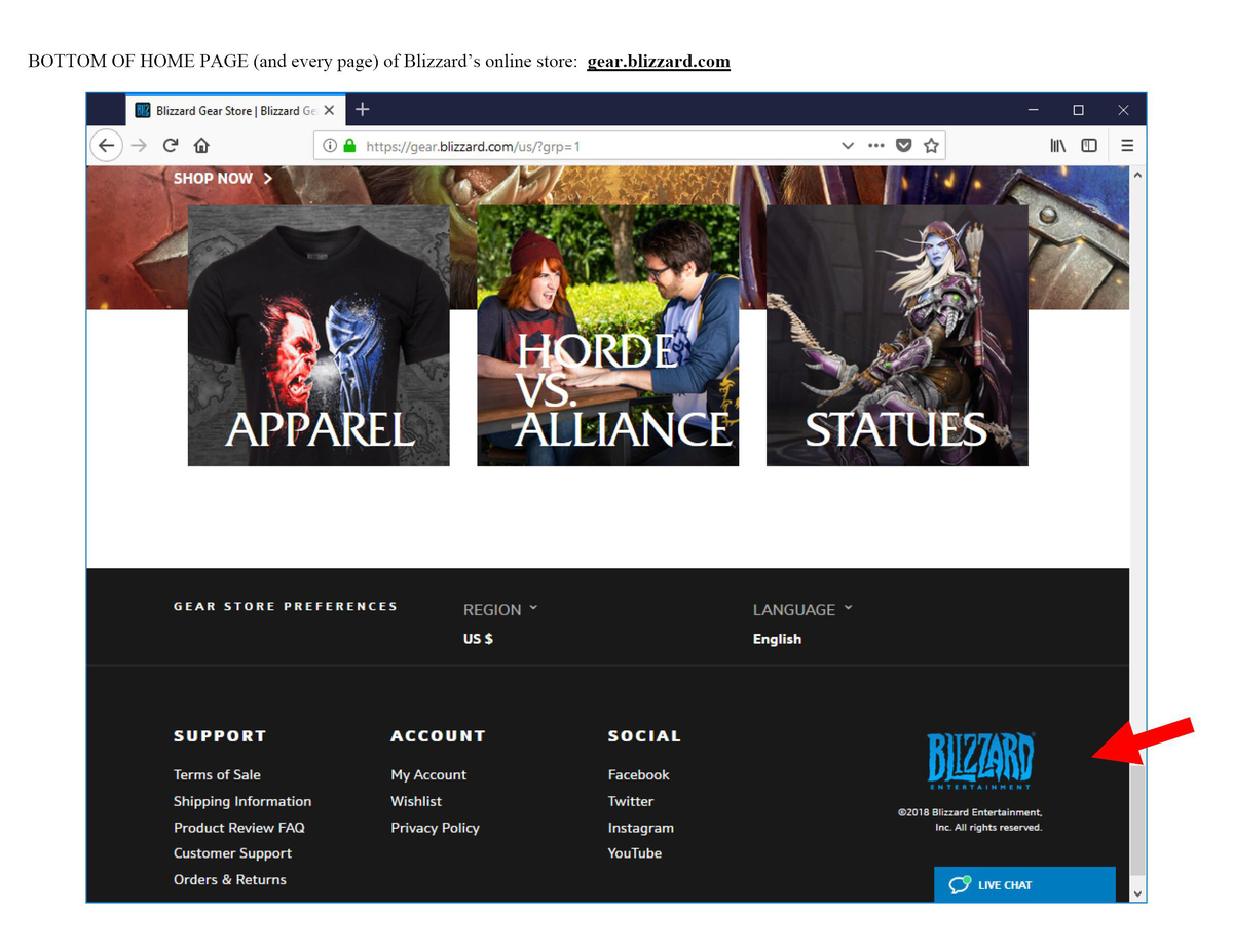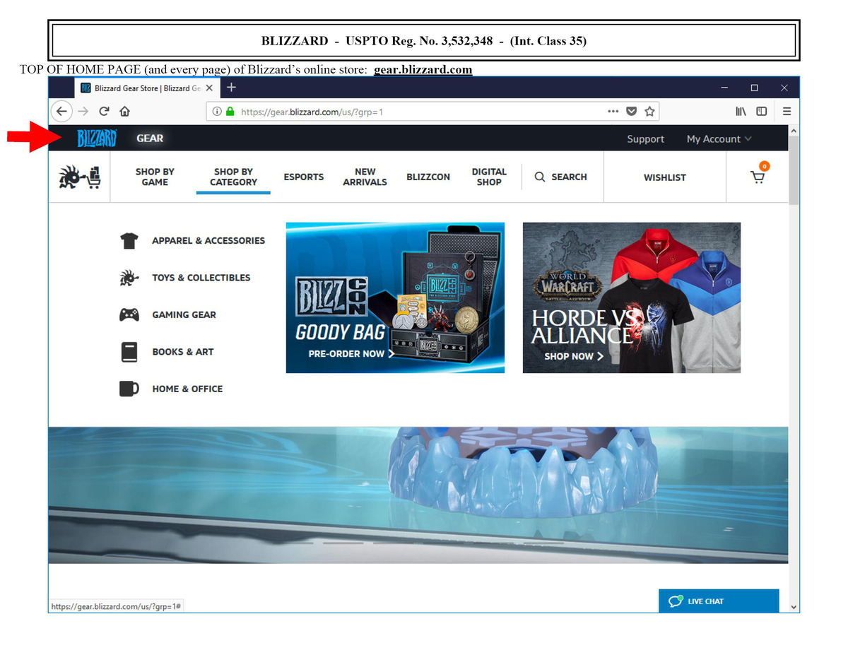 關(guān)于商標(biāo)申請人關(guān)注的自營商店證據(jù)能否作為第35類使用證據(jù)被美國專利商標(biāo)局接受這一問題。前文提及Blizzard面對Ava Labs提出的反訴理由曾主張其提交的使用證據(jù)是否存在瑕疵是審查員和申請人之間的問題,言外之意即是強(qiáng)調(diào)其提交的使用證據(jù)已被美國專利商標(biāo)局審查員認(rèn)可為合格的第35類使用證據(jù)。當(dāng)前實(shí)踐中,審查員大部分情況下會(huì)接受申請人在自己官網(wǎng)使用申請商標(biāo)零售自己產(chǎn)品的證據(jù)。作為參考,以下為Blizzard于2018維護(hù)其商標(biāo)注冊時(shí)提交的第35類零售商店服務(wù)使用證據(jù),已被接受: