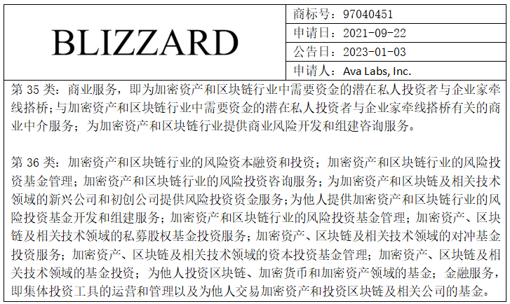 此次異議爭議源于Ava Labs向美國專利商標(biāo)局申請注冊“BLIZZARD”商標(biāo),申請覆蓋與區(qū)塊鏈相關(guān)的第35類商業(yè)服務(wù)和第36類金融服務(wù)。經(jīng)初步審定,商標(biāo)公告信息如下: