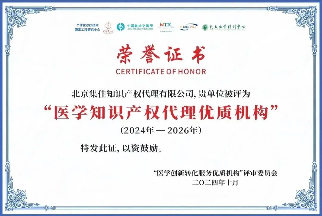近日,2024年度“醫(yī)學(xué)創(chuàng)新轉(zhuǎn)化優(yōu)質(zhì)服務(wù)機(jī)構(gòu)”遴選結(jié)果在??谂e辦的個(gè)體化醫(yī)學(xué)研討會(huì)暨第四屆衛(wèi)生健康創(chuàng)新與轉(zhuǎn)化管理論壇上正式公布,北京集佳知識(shí)產(chǎn)權(quán)代理有限公司憑借在醫(yī)學(xué)創(chuàng)新成果知識(shí)產(chǎn)權(quán)保護(hù)與轉(zhuǎn)化方面的優(yōu)秀成績(jī),榮獲2024年度“醫(yī)學(xué)知識(shí)產(chǎn)權(quán)代理優(yōu)質(zhì)機(jī)構(gòu)”稱號(hào)。