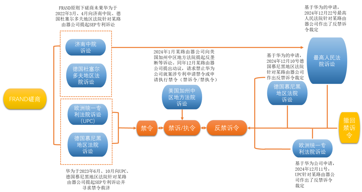 自2020年7月以來,華為公司基于FRAND原則表達(dá)了愿意與某路由器公司進(jìn)行磋商就案涉專利在內(nèi)的涉及Wi-Fi SEP專利達(dá)成許可并提供了許可費(fèi)率,但某路由器公司未給予積極回應(yīng),最終雙方磋商陷入僵局。后,華為公司自2022年7月開始的兩年間針對(duì)某路由器公司分別向我國濟(jì)南中院、德國杜塞爾多夫地區(qū)法院、德國慕尼黑地區(qū)法院以及歐洲統(tǒng)一專利法院(UPC)分別提起專利侵權(quán)訴訟。2024年1月某路由器公司在美國加州中區(qū)地方法院針對(duì)華為公司提起反壟斷訴訟,訴稱華為公司涉嫌違反美國《謝爾曼法》,企圖非法壟斷Wi-Fi技術(shù)市場(chǎng);且某路由器公司向華為公司表示其準(zhǔn)備進(jìn)一步向美國法院提起費(fèi)率訴訟,請(qǐng)求裁決華為公司持有的Wi-Fi SEP專利的全球許可費(fèi)率。