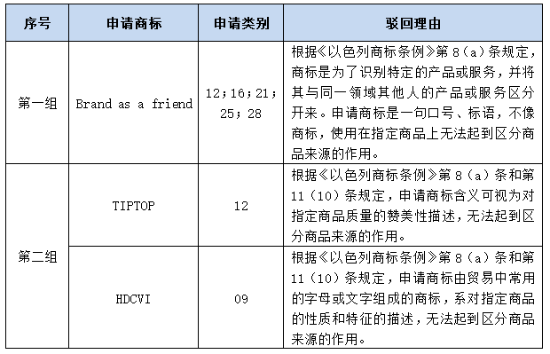 以色列官方下發(fā)缺顯駁回的法律依據(jù):《以色列商標(biāo)條例》第8(a)條和第11(10)條。具體而言,第8(a)條規(guī)定“任何商標(biāo),除非其能將商標(biāo)所有人的商品/服務(wù)與其他人的商品/服務(wù)區(qū)分開(kāi)來(lái),否則其不具備注冊(cè)為商標(biāo)的資格?!币约暗?1(10)條規(guī)定“由貿(mào)易中常用的數(shù)字、字母或文字組成的商標(biāo),用于區(qū)分或描述商品或商品類別,或直接指代其特性和質(zhì)量,除非該商標(biāo)已通過(guò)大量使用獲得顯著性特征”。