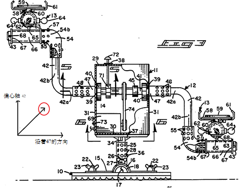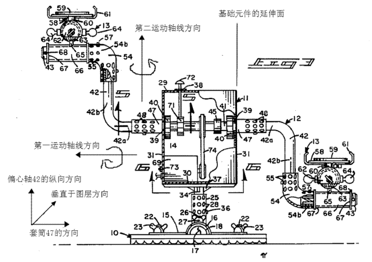 對比文件4僅僅公開了曲柄的轉動平面能夠圍繞通過銷57所限定的水平軸線來調(diào)整。然而,對比文件4中的曲柄不能夠被等同為案例中的“運動元件(17,18)”因為曲柄并非安裝在底板94上而是安裝在殼體90上。