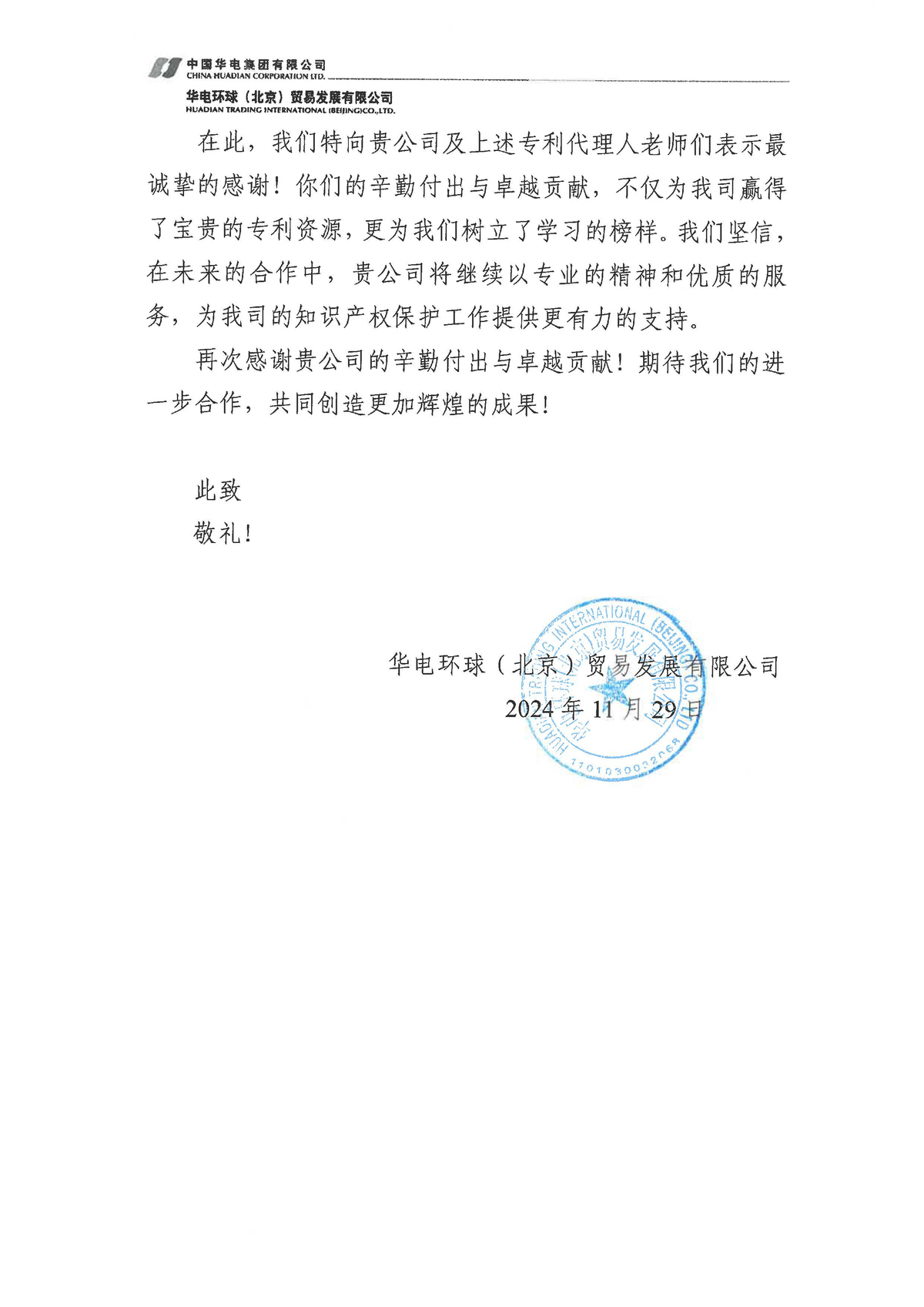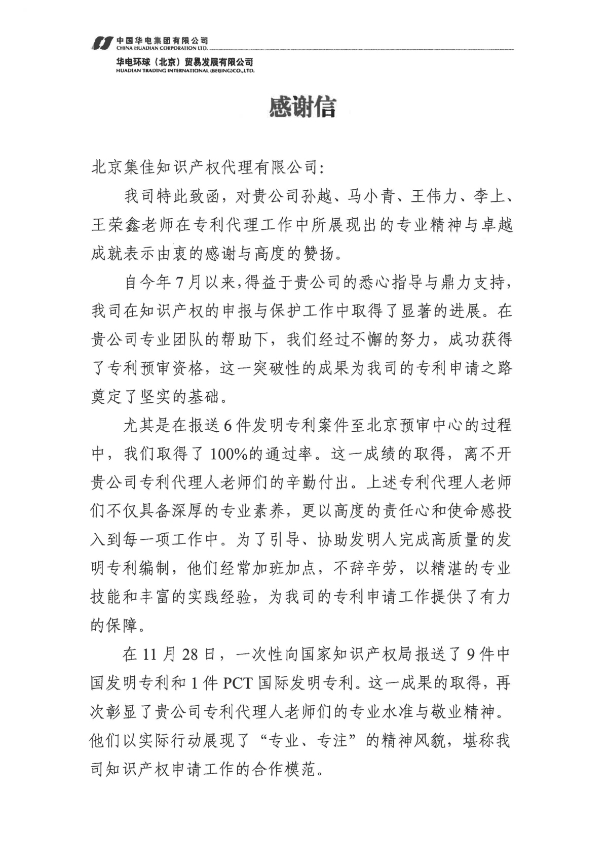 近日,集佳收到客戶(hù)華電環(huán)球(北京)貿(mào)易發(fā)展有限公司的感謝信,對(duì)集佳在知識(shí)產(chǎn)權(quán)申報(bào)與保護(hù)工作中給予的專(zhuān)業(yè)指導(dǎo)與大力支持表示由衷感謝,同時(shí)對(duì)集佳孫越、馬小青、王偉力、李上、王榮鑫等專(zhuān)業(yè)人員在專(zhuān)利代理工作中所展現(xiàn)出的專(zhuān)業(yè)精神與卓越成就表示高度贊揚(yáng)!