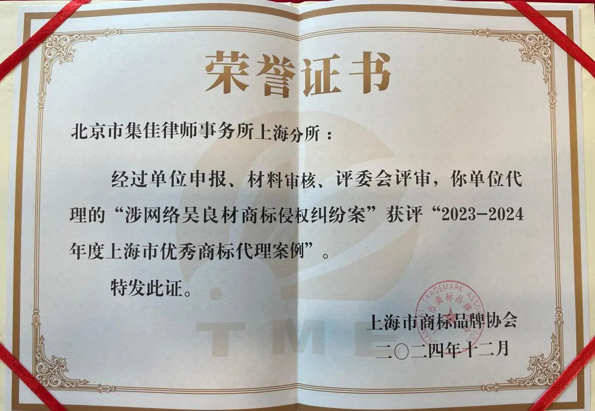 2025年1月7日,上海市商標品牌協(xié)會召開第六屆會員代表大會,會上表彰了被評為2023-2024年度“上海市優(yōu)秀商標代理案例”及“上海市優(yōu)秀商標代理案例提名”的案例,集佳上海分所的兩個案例成功入選。