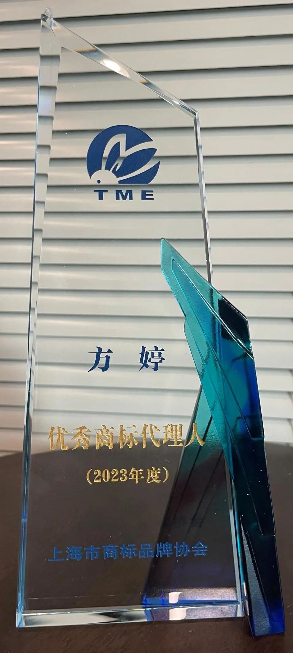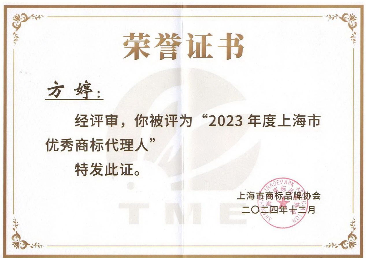 集佳上海分所方婷律師被評為2023年度“上海市優(yōu)秀商標(biāo)代理人”。