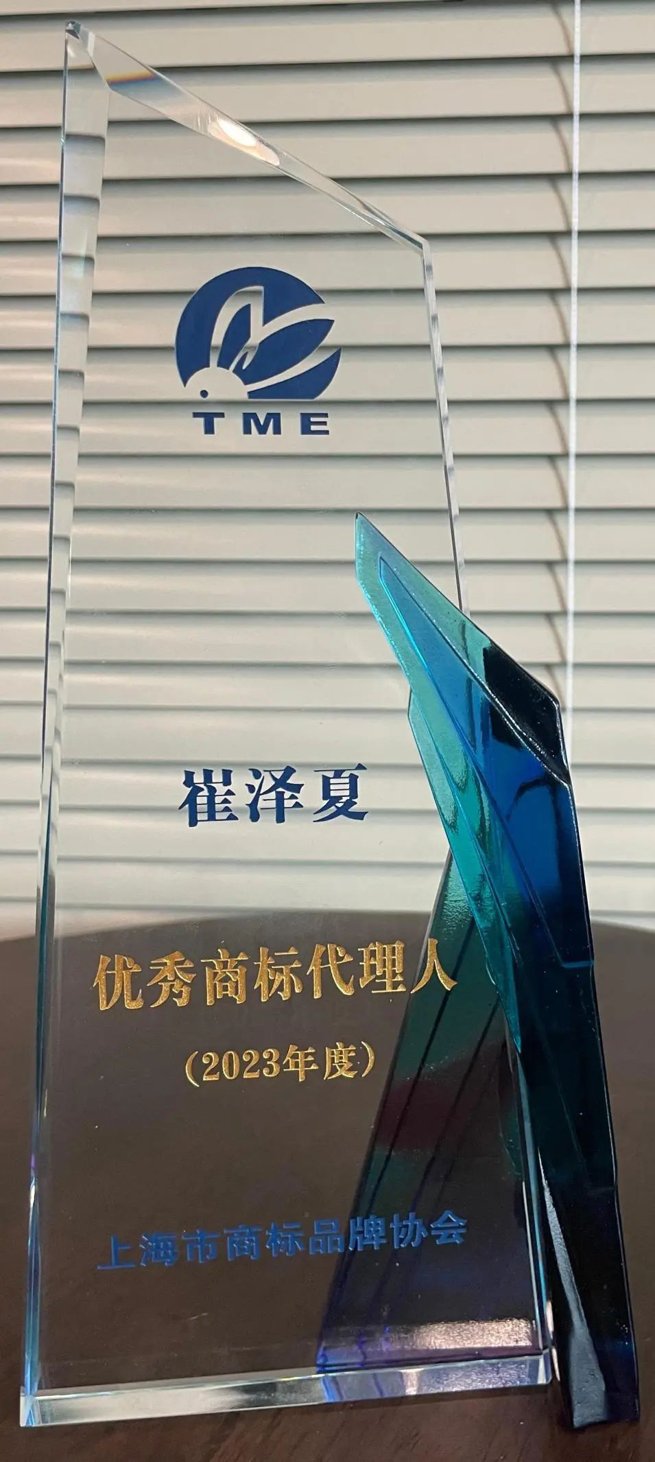 集佳上海分所崔澤夏律師被評為2023年度“上海市優(yōu)秀商標(biāo)代理人”。