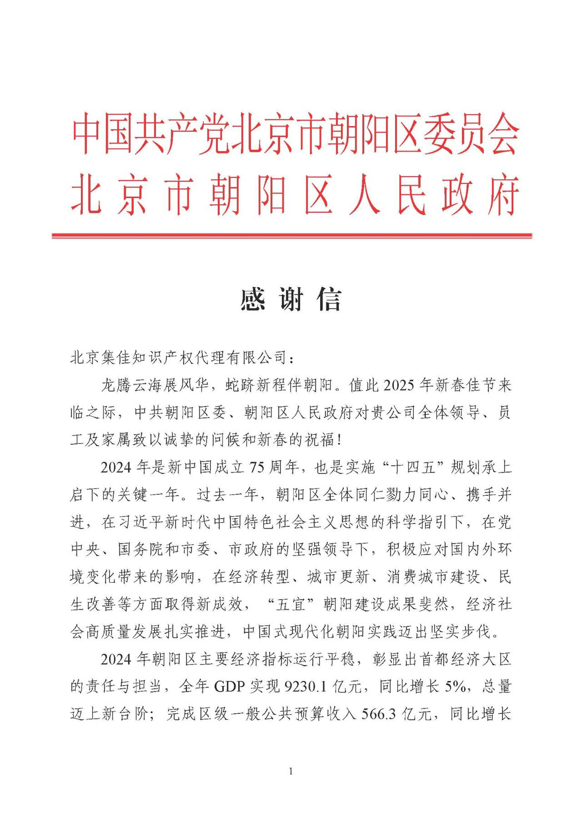 新春佳節(jié)來(lái)臨之際,集佳收到北京市朝陽(yáng)區(qū)委、區(qū)政府發(fā)來(lái)的感謝信。信中,區(qū)委、區(qū)政府肯定和感謝了集佳過(guò)去一年為朝陽(yáng)區(qū)經(jīng)濟(jì)社會(huì)發(fā)展作出的貢獻(xiàn),并對(duì)集佳全體領(lǐng)導(dǎo)、員工及家屬致以誠(chéng)摯的問(wèn)候和新春的祝福!
