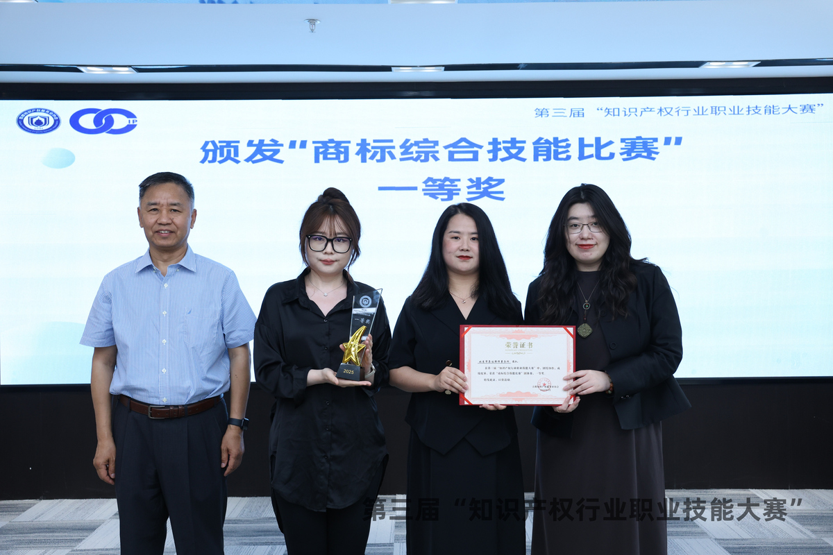 ▲甘紹寧副理事長(zhǎng)為商標(biāo)組一等獎(jiǎng)選手郝博文、王嬌嬌、王斯沄頒獎(jiǎng)