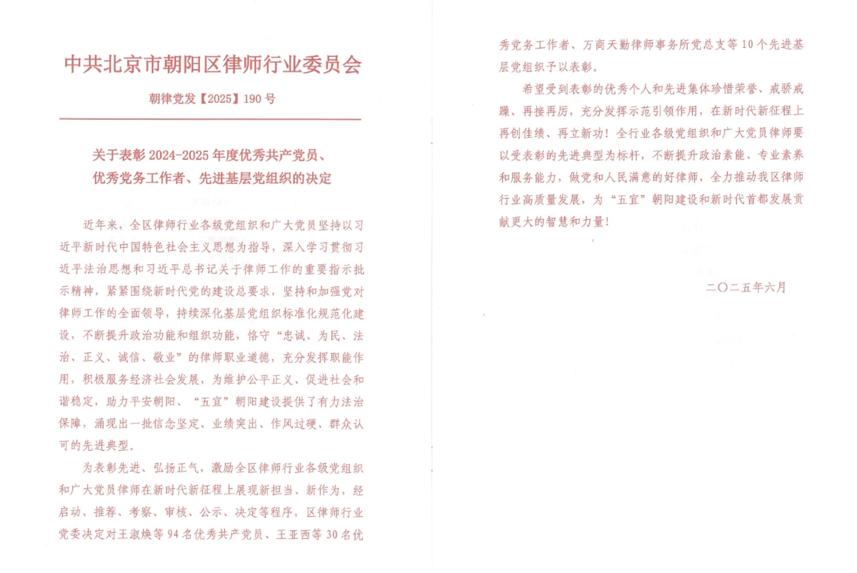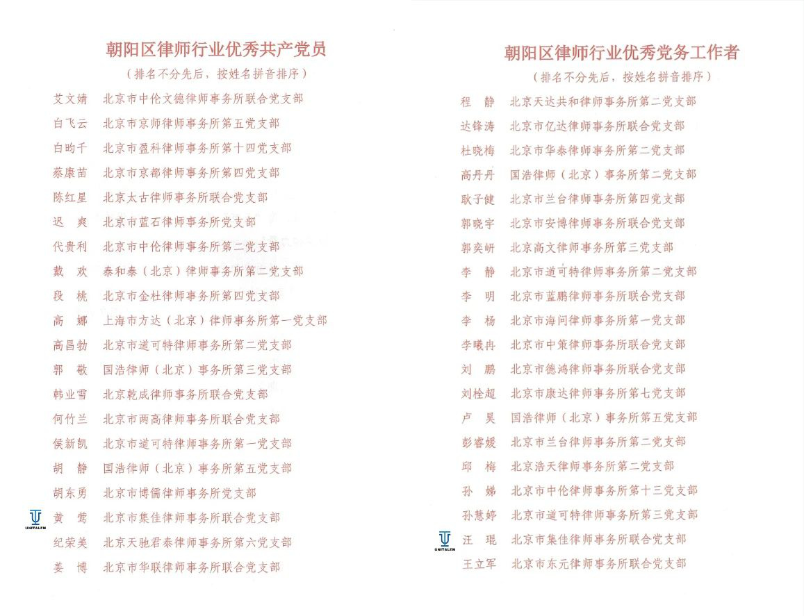6月27日,朝陽(yáng)區(qū)律師行業(yè)黨委召開了朝陽(yáng)區(qū)律師行業(yè)慶祝中國(guó)共產(chǎn)黨成立104周年暨總結(jié)表彰大會(huì),集佳律所聯(lián)合黨支部黨員黃鶯榮獲“朝陽(yáng)區(qū)律師行業(yè)優(yōu)秀共產(chǎn)黨員”稱號(hào),支部黨員汪琨榮獲“朝陽(yáng)區(qū)律師行業(yè)優(yōu)秀黨務(wù)工作者”稱號(hào)。